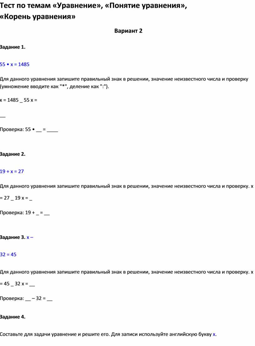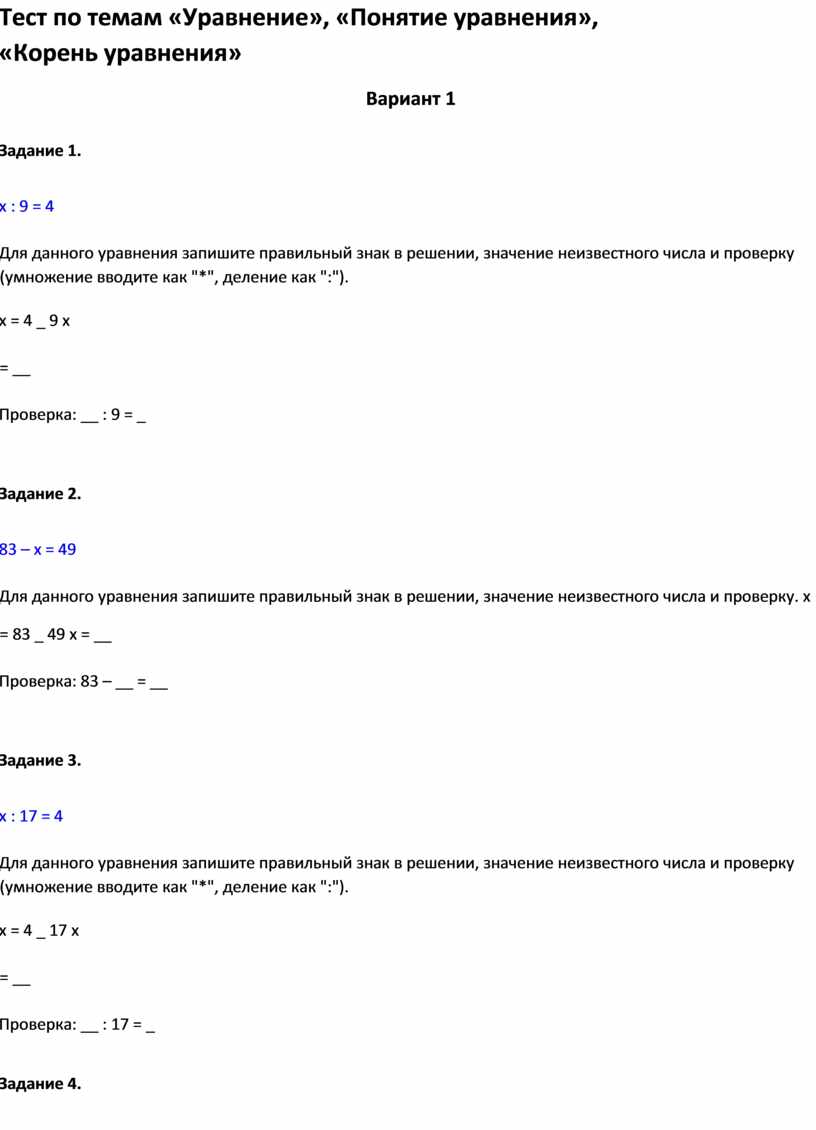 Тест по темам «Уравнение», «Понятие уравнения»,