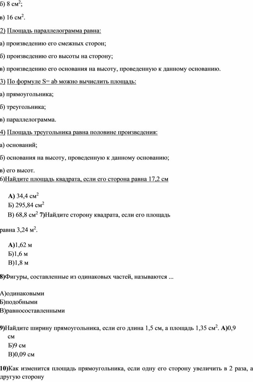 3) Площадь прямоугольника со сторонами a, b равна а)S= ab;