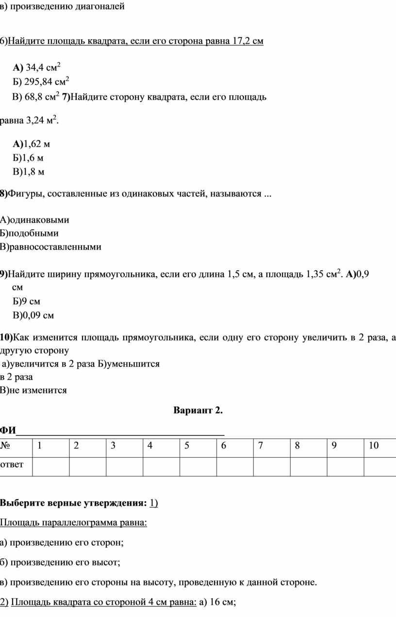 2) Площадь квадрата со стороной 4 см равна: а) 16 см;