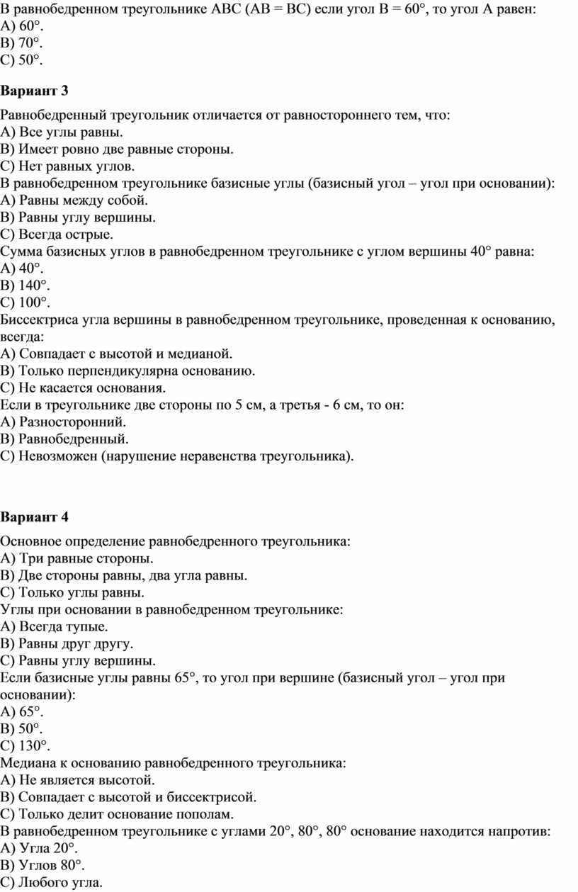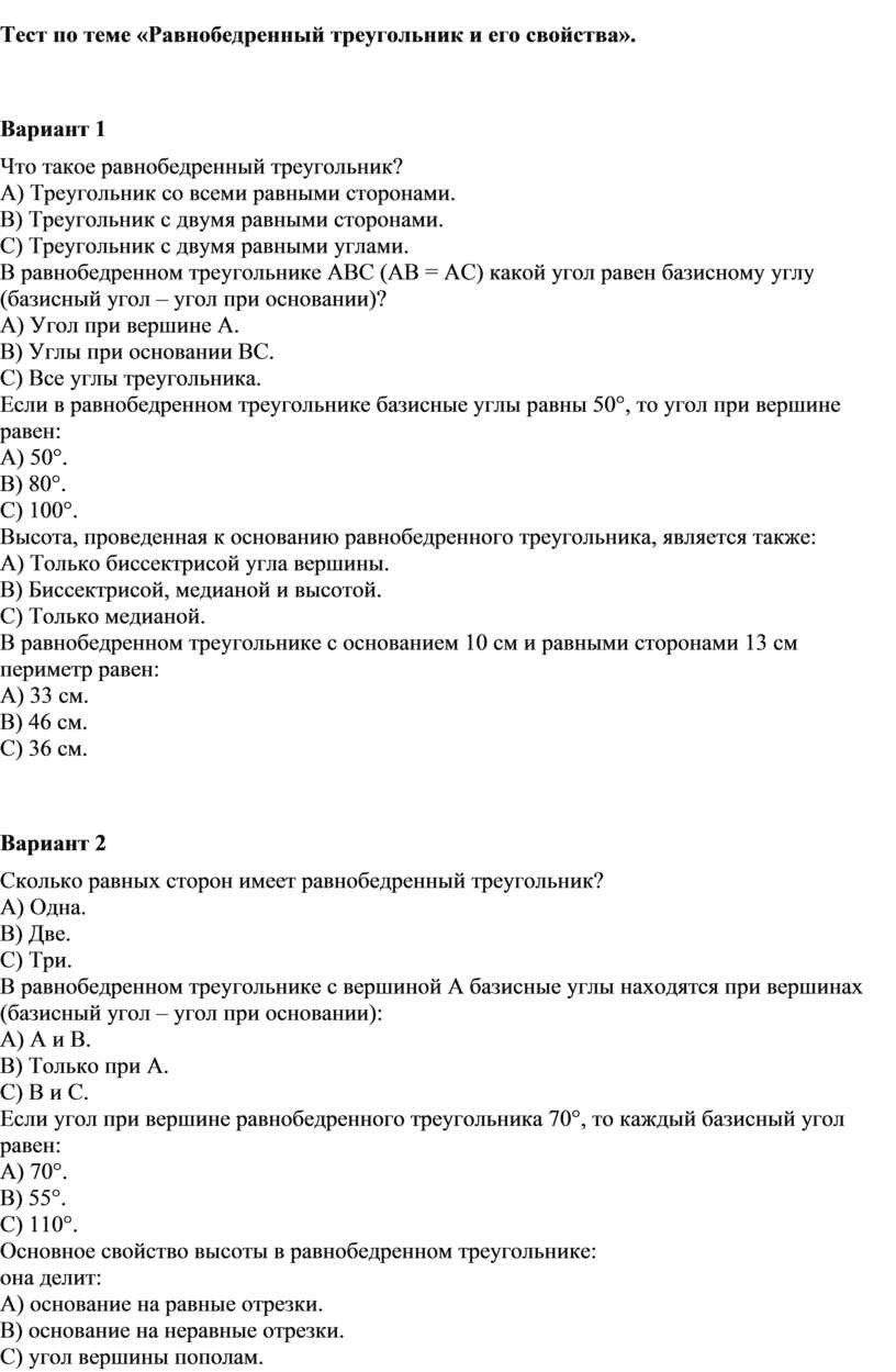 Тест по теме «Равнобедренный треугольник и его свойства».