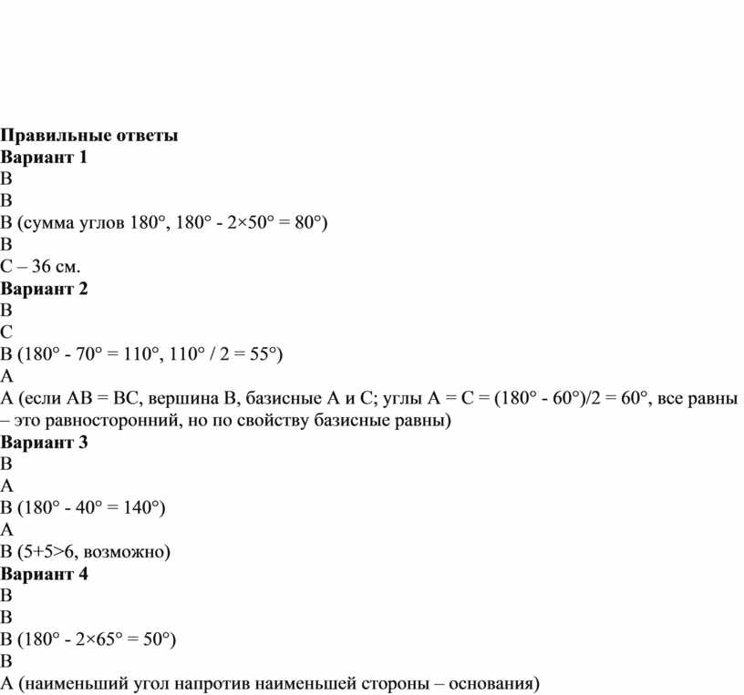 5. A (если AB = BC, вершина B, базисные A и C; углы A = C = (180° - 60°)/2 = 60°, все равны – это равносторонний, но по свойству базисные равны)