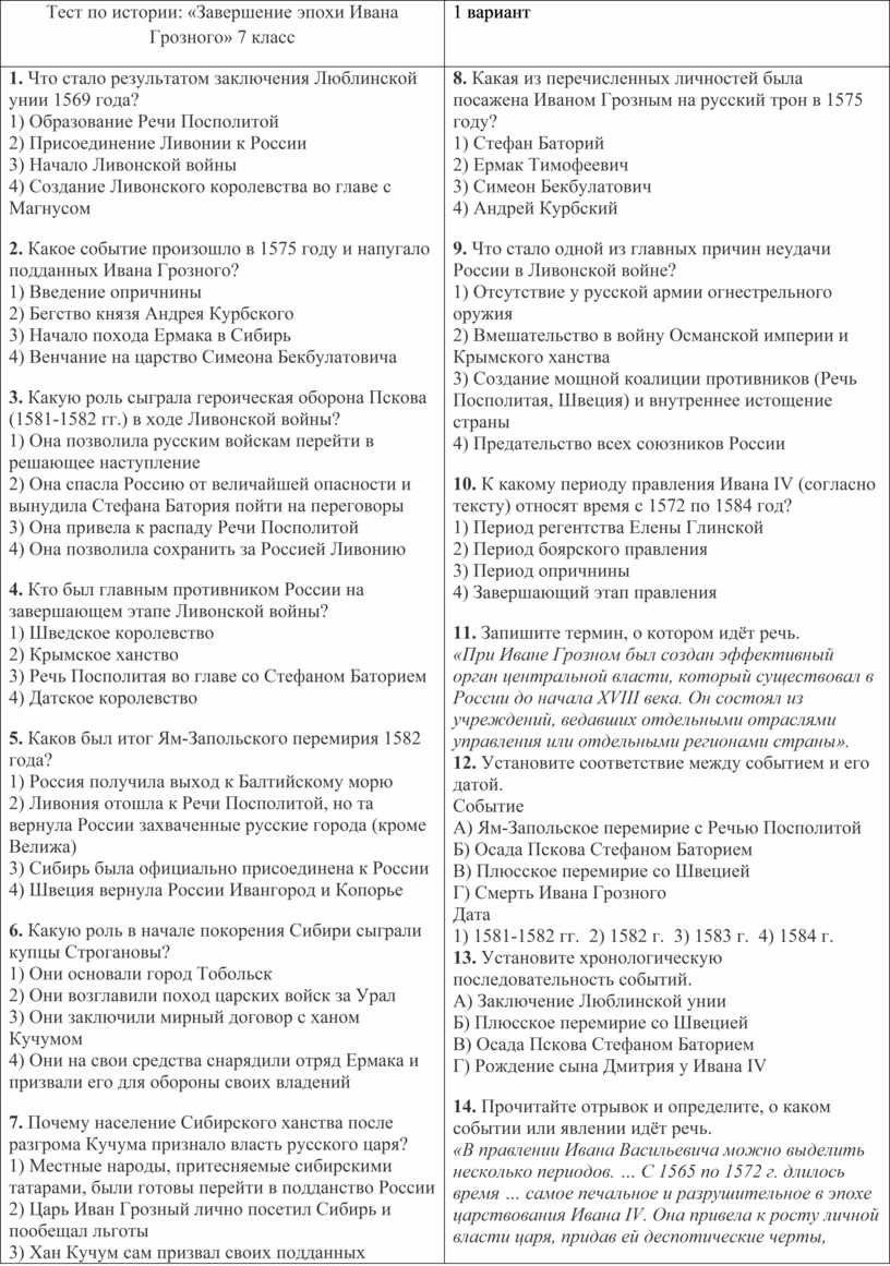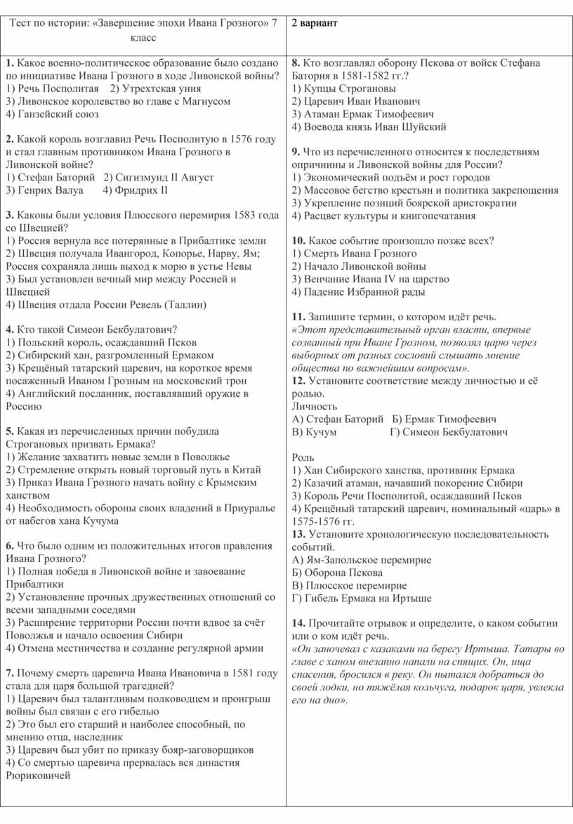1. Какое военно-политическое образование было создано по инициативе Ивана Грозного в ходе Ливонской войны? 1) Речь Посполитая 2) Утрехтская уния 2. Какой король возглавил Речь Посполитую в 1576 году и стал главным противником Ивана Грозного в Ливонской войне? 1) Стефан Баторий 2) Сигизмунд II Август 3. Каковы были условия Плюсского перемирия 1583 года со Швецией? 1) Россия вернула все потерянные в Прибалтике земли 4. Кто такой Симеон Бекбулатович? 1) Польский король, осаждавший Псков 5. Какая из перечисленных причин побудила Строгановых призвать Ермака? 1) Желание захватить новые земли в Поволжье 6. Что было одним из положительных итогов правления Ивана Грозного? 1) Полная победа в Ливонской войне и завоевание Прибалтики 7. Почему смерть царевича Ивана Ивановича в 1581 году стала для царя большой трагедией? 1) Царевич был талантливым полководцем и проигрыш войны был