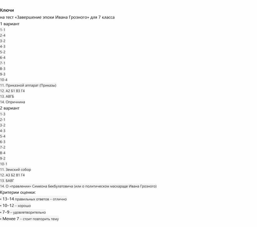 Тест по истории: «Завершение эпохи Ивана Грозного» 7 класс |