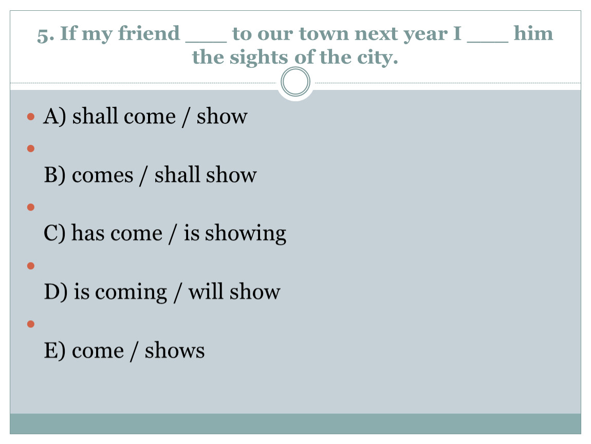 5. If my friend ___ to our town next year I ___ him the sights of the city.