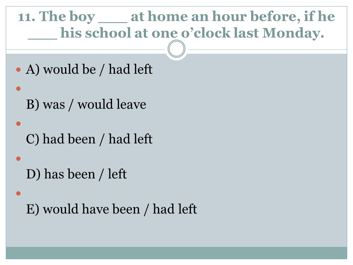 11. The boy ___ at home an hour before, if he ___ his school at one o’clock last Monday.