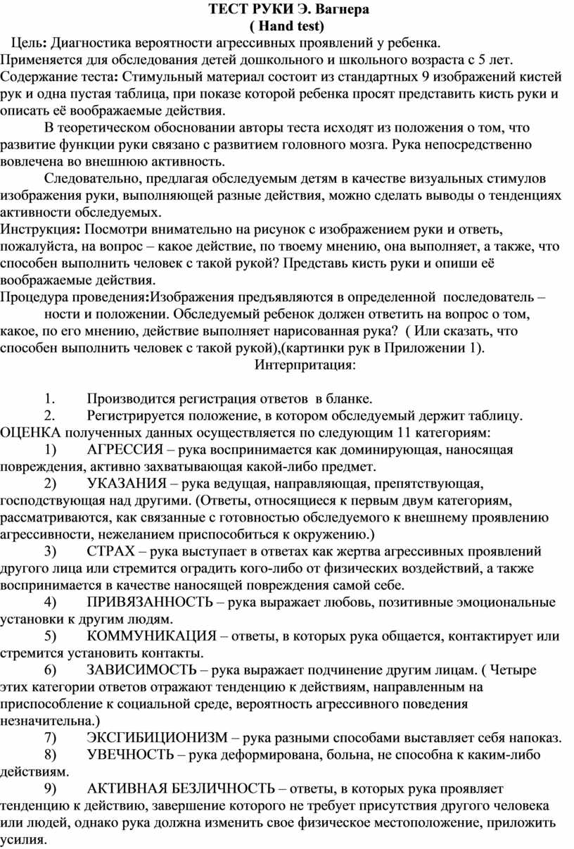 Содержание теста: Стимульный материал состоит из стандартных 9 изображений кистей рук и одна пустая таблица, при показе которой ребенка просят представить кисть руки и описать её воображаемые действия.