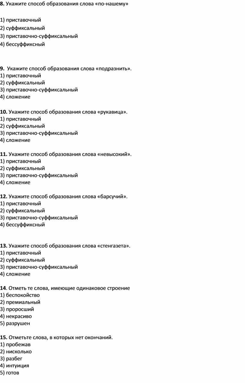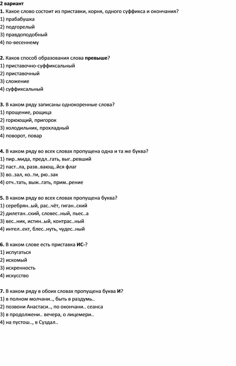 1. Какое слово состоит из приставки, корня, одного суффикса и окончания?
