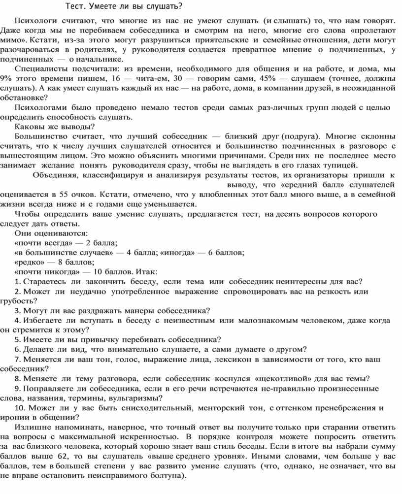 Чтобы определить ваше умение слушать, предлагается тест, на десять вопросов которого следует дать ответы.