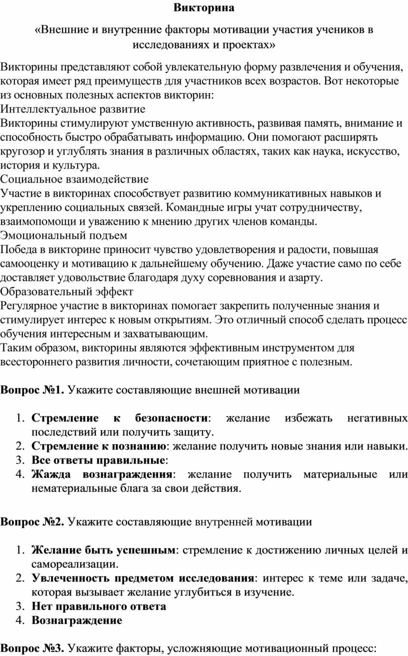Таким образом, викторины являются эффективным инструментом для всестороннего развития личности, сочетающим приятное с полезным.