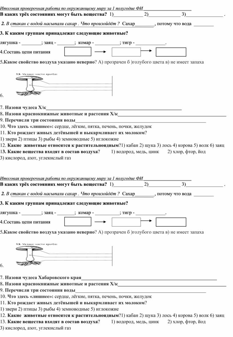 7. Назови чудеса Х/к_______________________________________________________ 8. Назови краснокнижные животные и растения Х/к____________________________________________ 9. Перечисли три состояния воды_____________________________________________________ 10. Что здесь «лишнее»: сердце, лёгкие, пятка, печень, почки, желудок 11. Кто рождает живых детёнышей и выкармливает их молоком? 1) звери 2) птицы 3) рыбы 4) земноводные 5) иглокожие 12. Какие животные относятся к растительноядным?1) кабан 2) щука 3) лось 4) корова 5) волк 6) заяц 13. Какие вещества входят в состав воздуха? 1) водород, медь, цинк 2) хлор, фтор, йод 3) кислород, азот, углекислый газ