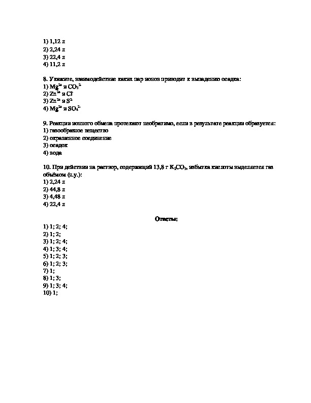 8. Укажите, взаимодействие каких пар ионов приводит к выпадению осадка: