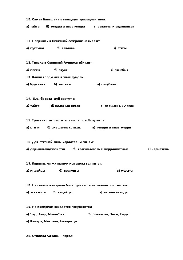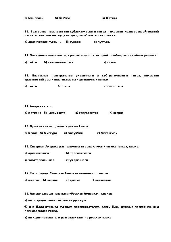 20. Столица Канады – город:а) Монреаль б) Квебек в) Оттава