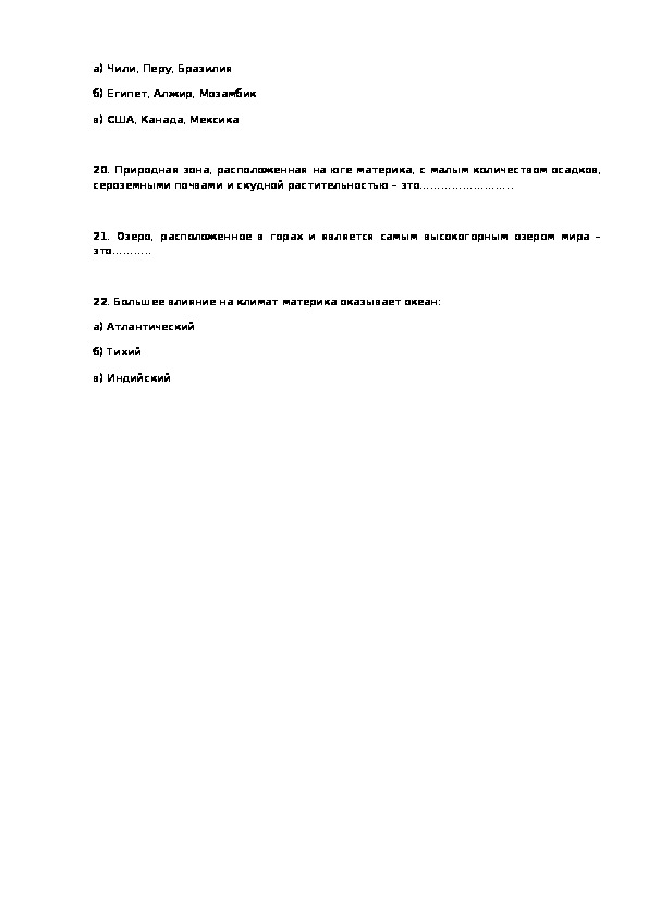 20. Природная зона, расположенная на юге материка, с малым количеством осадков,