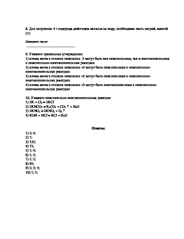 → H+8. Для получения 4 г водорода действием металла на воду, необходимо взять натрий, массой