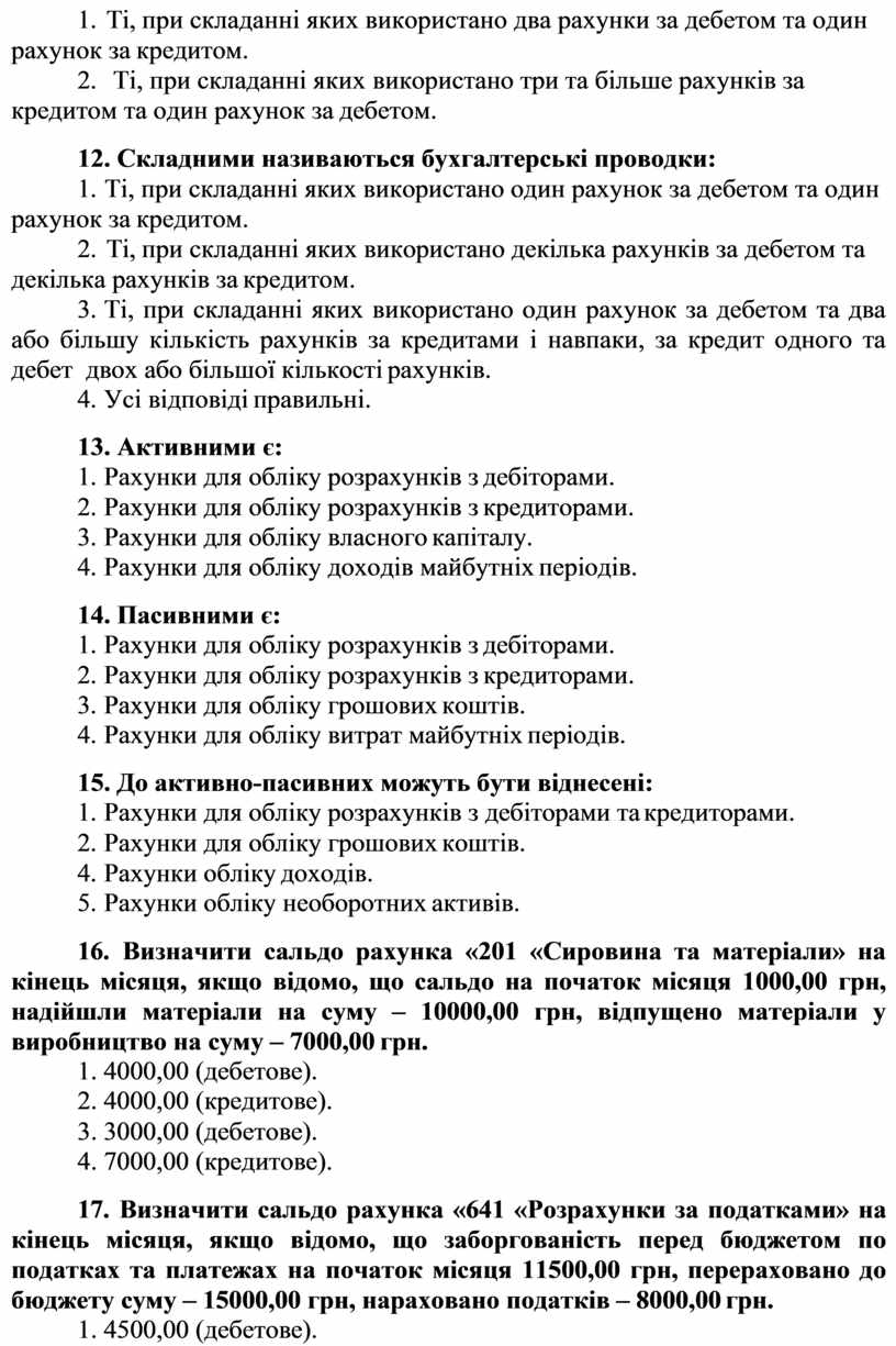 16. Визначити сальдо рахунка «201 «Сировина та матеріали» на кінець місяця, якщо відомо, що сальдо на початок місяця 1000,00 грн, надійшли матеріали на суму – 10000,00 грн, відпущено матеріали у виробництво на суму – 7000,00 грн.
