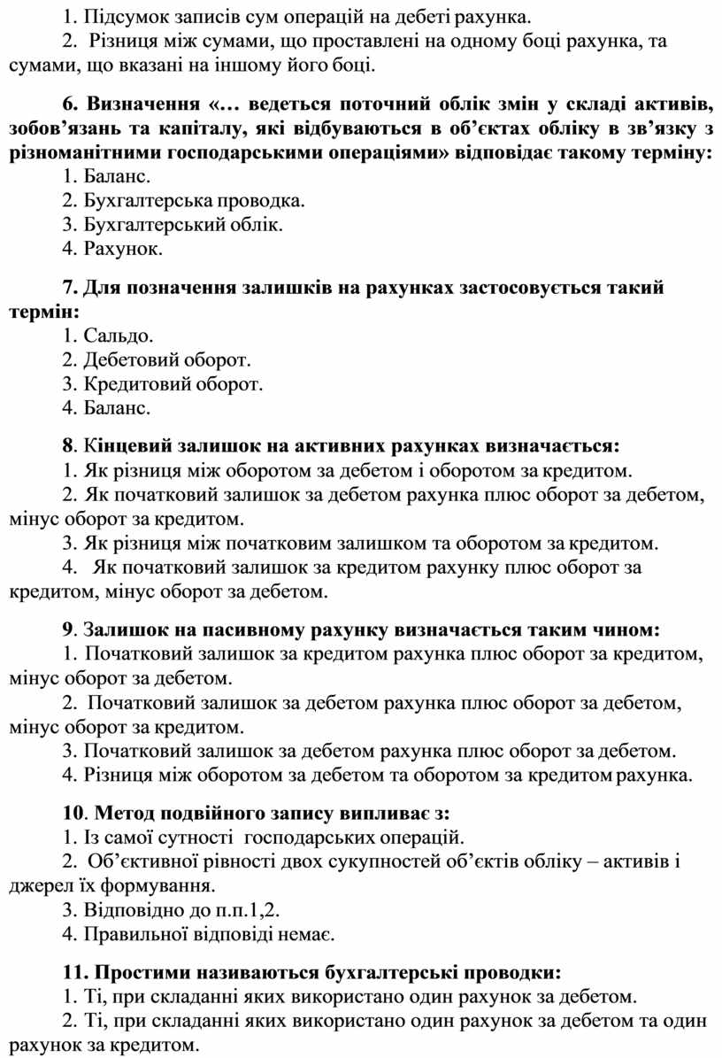 1. Сума записів за дебетом дорівнює сумі записів за кредитом кожного рахунка.