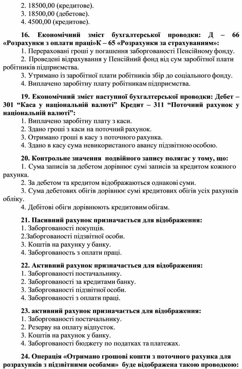 17. Визначити сальдо рахунка «641 «Розрахунки за податками» на кінець місяця, якщо відомо, що заборгованість перед бюджетом по податках та платежах на початок місяця 11500,00 грн, перераховано до бюджету суму – 15000,00 грн, нараховано податків – 8000,00 грн.