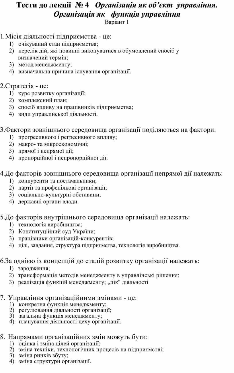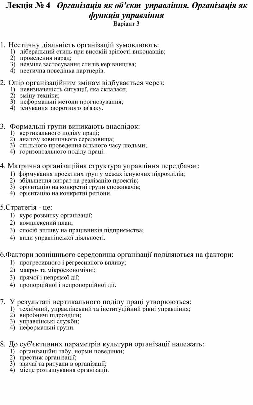 Тести до лекції № 4 Організація як об’єкт управління. Організація як функція управління