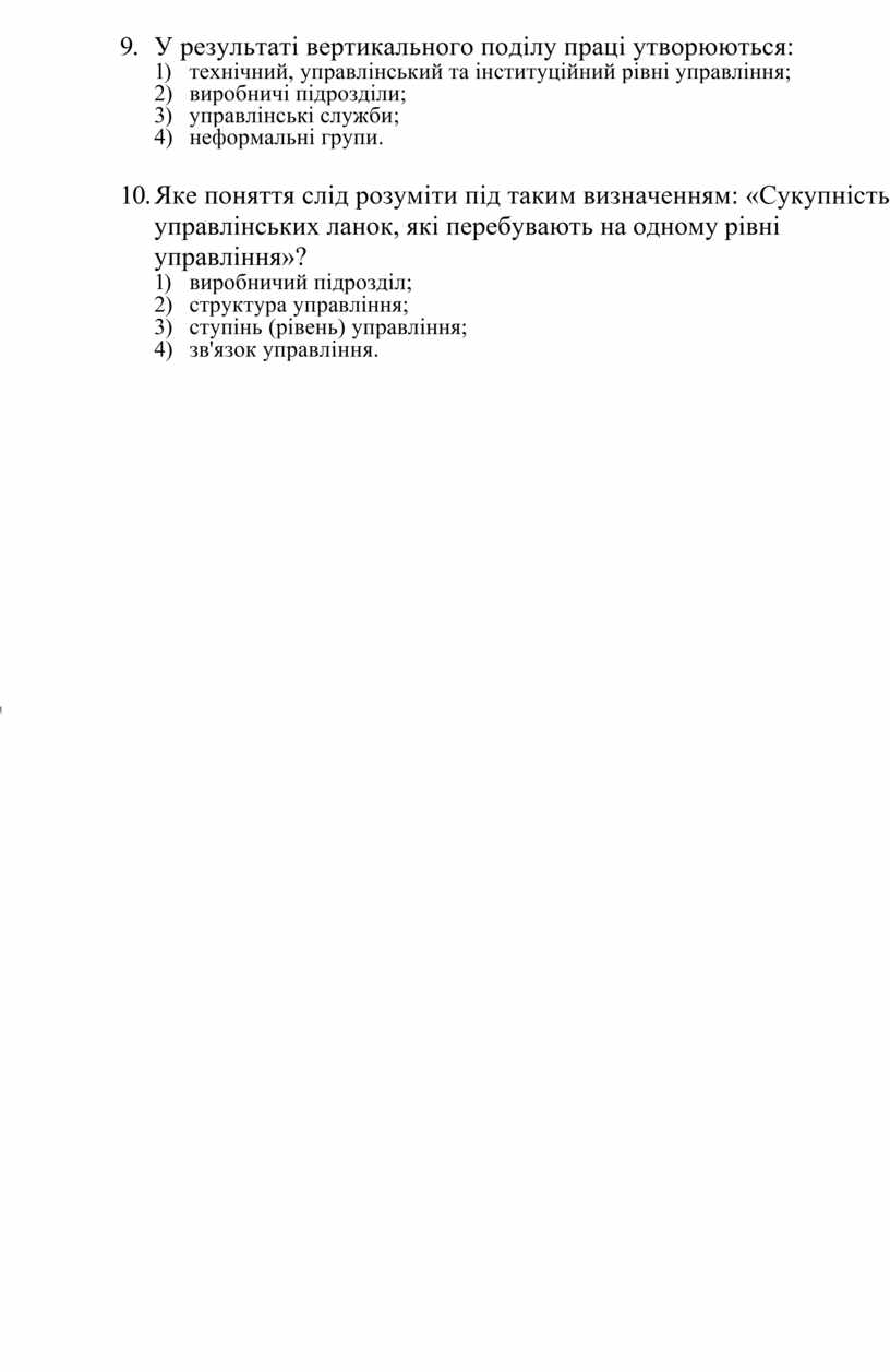 9. У результаті вертикального поділу праці утворюються: