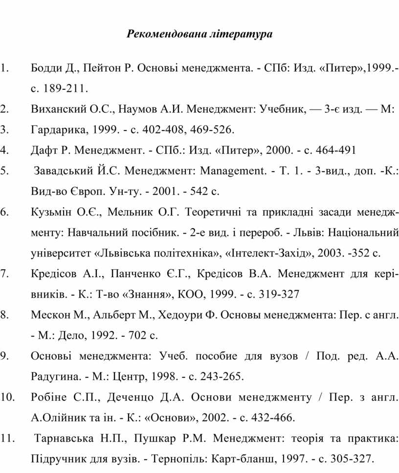 11. Тарнавська Н.П., Пушкар P.M. Менеджмент: теорія та практика: Підручник для вузів. - Тернопіль: Карт-бланш, 1997. - с. 305-327.