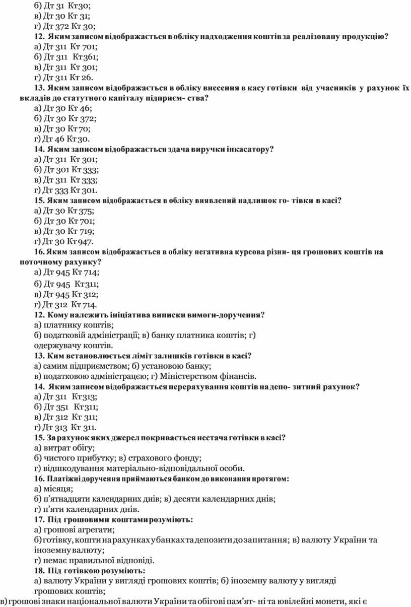 14. Яким записом відображається в обліку внесення в касу готівки від учасників у рахунок їх вкладів до статутного капіталу підприєм- ства?