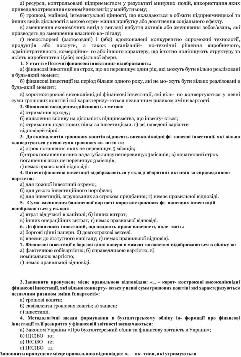 5. Заповнити пропущене місце правильною відповіддю: «... – ак- тиви, які утримуються підприємством з метою збільшення прибутку (процентів, дивідендів), зростання вартості капіталу або інше для ін- вестора»: