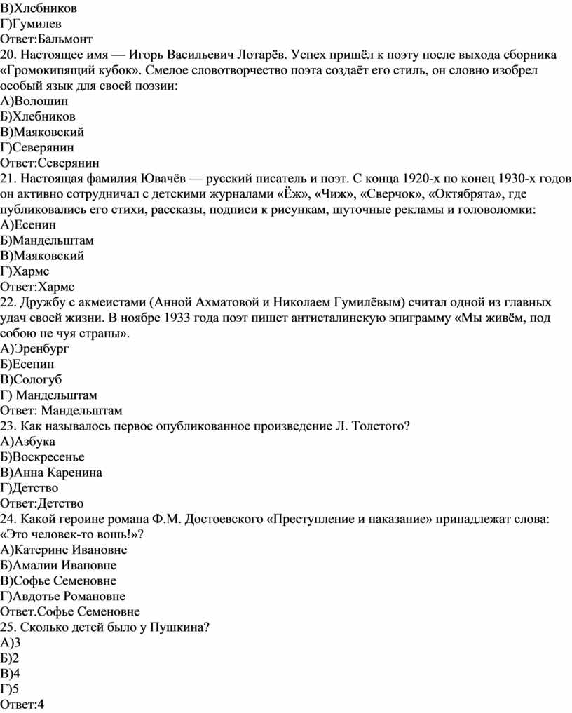 20. Настоящее имя — Игорь Васильевич Лотарёв. Успех пришёл к поэту после выхода сборника «Громокипящий кубок». Смелое словотворчество поэта создаёт его стиль, он словно изобрел особый язык для своей поэзии: