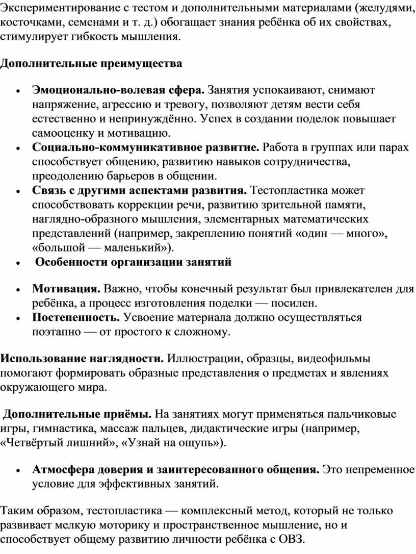 Таким образом, тестопластика — комплексный метод, который не только развивает мелкую моторику и пространственное мышление, но и способствует общему развитию личности ребёнка с ОВЗ.