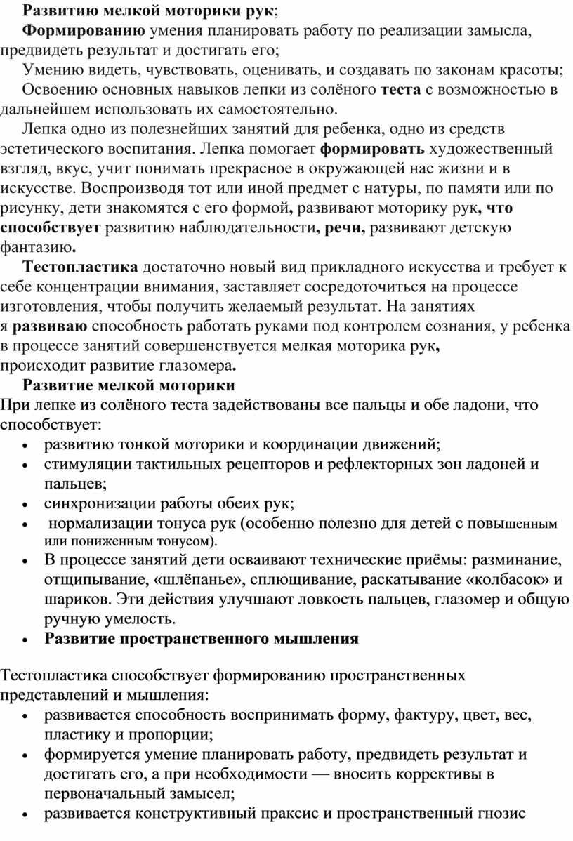 Тестопластика достаточно новый вид прикладного искусства и требует к себе концентрации внимания, заставляет сосредоточиться на процессе изготовления, чтобы получить желаемый результат. На занятиях я развиваю способность работать руками под контролем сознания, у ребенка в процессе занятий совершенствуется мелкая моторика рук, происходит развитие глазомера.