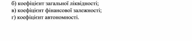 б) коефіцієнт загальної ліквідності; в) коефіцієнт фінансової залежності; г) коефіцієнт автономності.