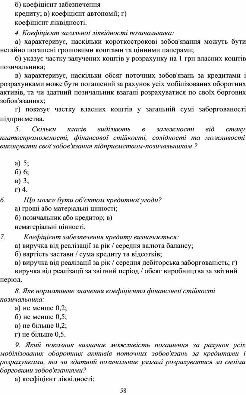 б) коефіцієнт забезпечення кредиту; в) коефіцієнт автономії; г) коефіцієнт ліквідності.