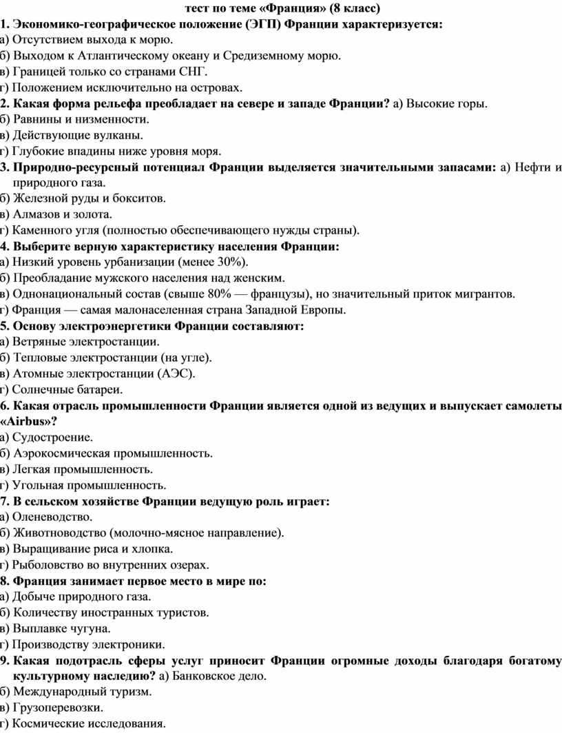 1. Экономико-географическое положение (ЭГП) Франции характеризуется: