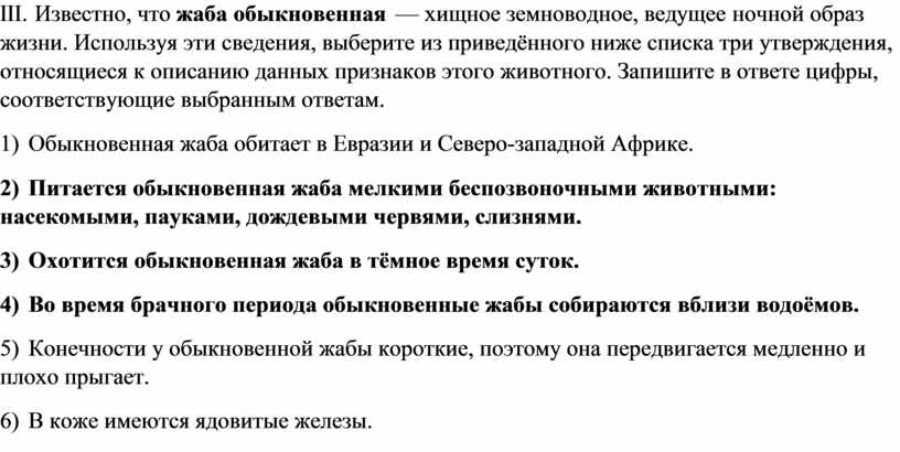 III. Известно, что жаба обыкновенная — хищное земноводное, ведущее ночной образ жизни. Используя эти сведения, выберите из приведённого ниже списка три утверждения, относящиеся к описанию данных признаков этого животного. Запишите в ответе цифры, соответствующие выбранным ответам.