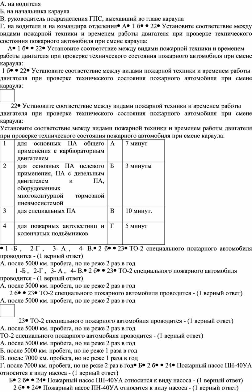 Количество видов технического обслуживания пожарных автомобилей - (1 верный ответ) А. пять Б. шесть В. семь Г. восемь