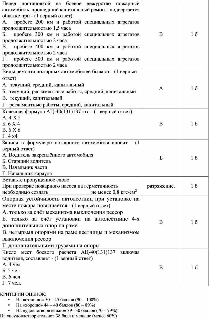 Перед постановкой на боевое дежурство пожарный автомобиль, прошедший капитальный ремонт, подвергается обкатке при - (1 верный ответ) А. пробеге 200 км и работой специальных агрегатов продолжительностью 1,5 часа Б. пробеге 300 км и работой специальных агрегатов продолжительностью 2 часа В. пробеге 400 км и работой специальных агрегатов продолжительностью 2 часа Г. пробеге 500 км и работой специальных агрегатов продолжительностью 2 часа |