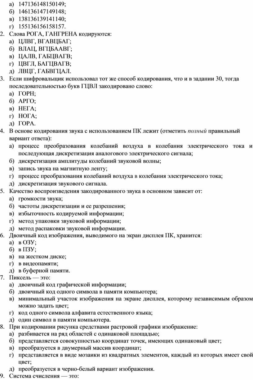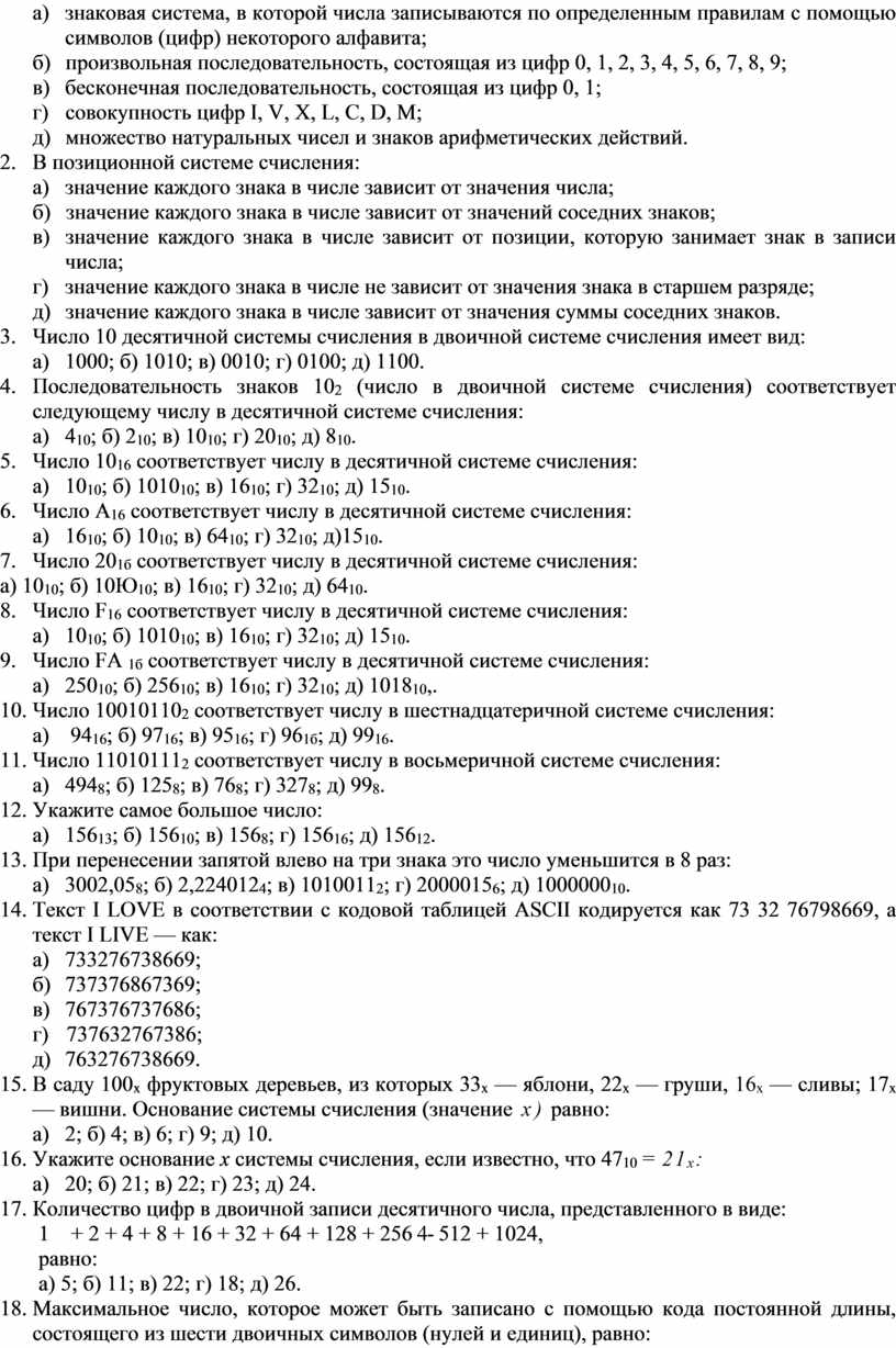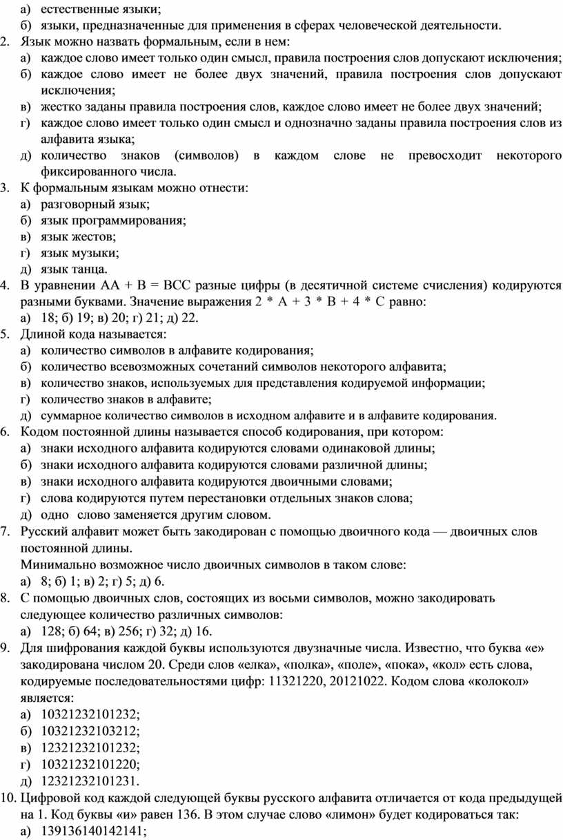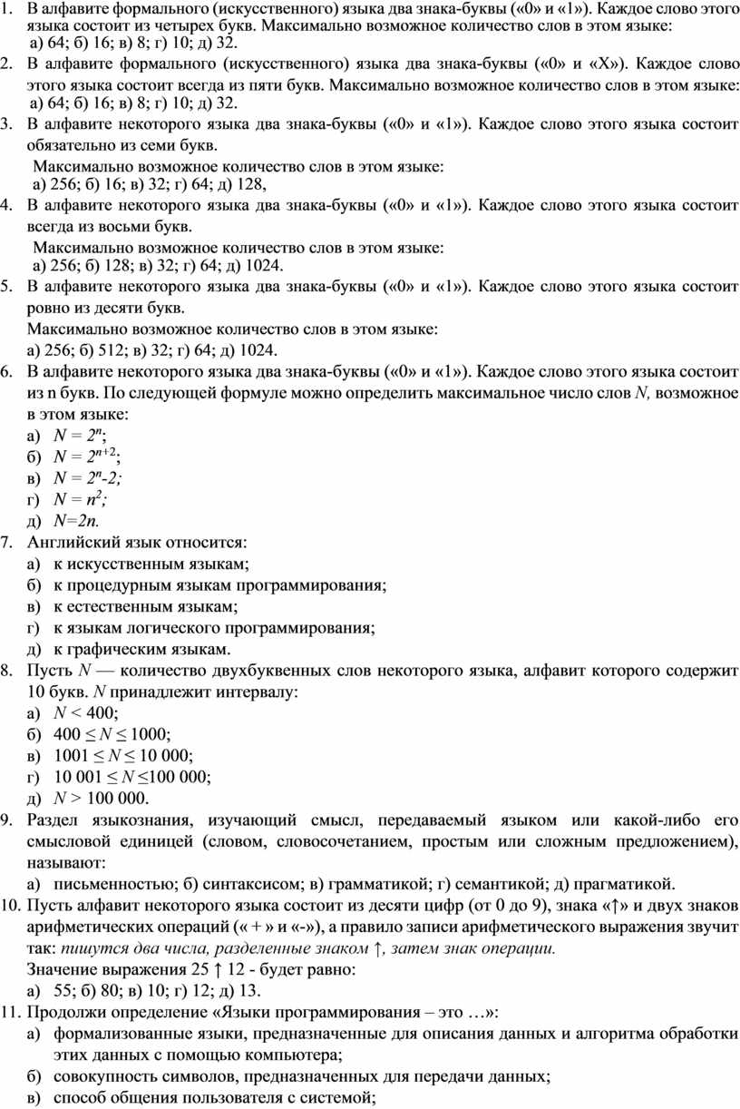 10. В алфавите формального (искусственного) языка два знака-буквы («0» и «1»). Каждое слово этого языка состоит из четырех букв. Максимально возможное количество слов в этом языке: