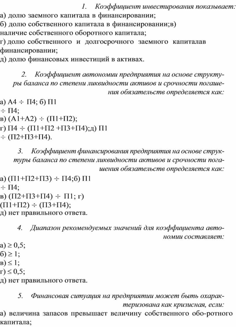 б) коэффициент собственного финансирования; в) коэффициент инвестирования;
