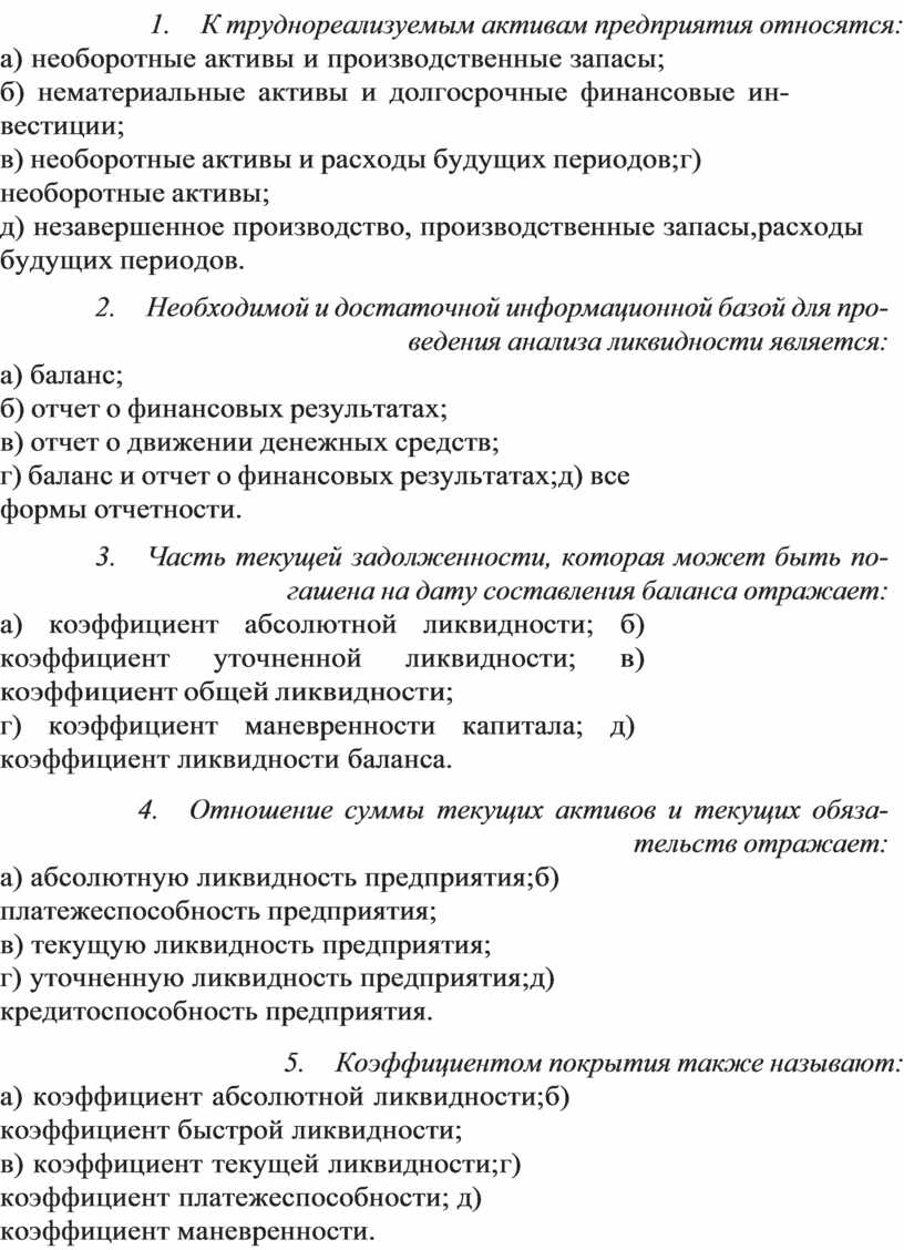 64. Платёжеспособность предприятия на основе структуры баланса по степени ликвидности активов и срочности погашения обязательств определяется как: