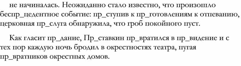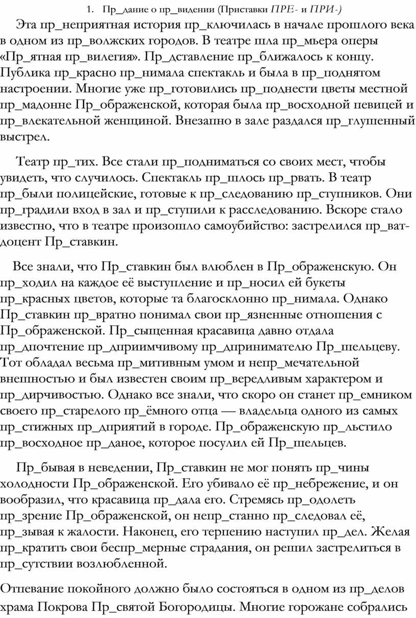 Театр пр_тих. Все стали пр_подниматься со своих мест, чтобы увидеть, что случилось. Спектакль пр_шлось пр_рвать. В театр пр_были полицейские, готовые к пр_следованию пр_ступников. Они пр_градили вход в зал и пр_ступили к расследованию. Вскоре стало известно, что в театре произошло самоубийство: застрелился пр_ват-доцент Пр_ставкин.