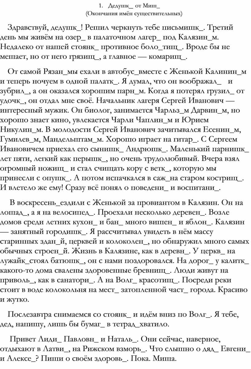 Здравствуй, дедушк_! Решил черкнуть тебе письмишк_. Третий день мы живём на озер_ в палаточном лагер_ под Калязин_м. Недалеко от нашей стоянк_ противное боло_тищ_. Вроде бы не мешает, но от него грязищ_, а главное — комарищ_.