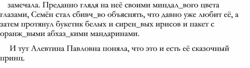Задумч_во поправляя кар_кул_вый воротник плюш_вого пальто и кутаясь в кле__атый фланел_вый шарф, Алевтина Павловна Октябр_ская шла на работу. Рез_кий ветер румянил её весну__атое лицо и трепал рыж_ватые волосы. Недавняя декабр_ская оттепель сменилась январ_скими морозами, и потому протоптанная в крупи__атом снегу дорожка была уз_кой и скольз_кой. Проходя мимо ресторана, покрытого узор__атой черепи__атой крышей, Алевтина Павловна поскользнулась и, чтобы не упасть, схватилась за затейл_вую решё__атую изгородь.