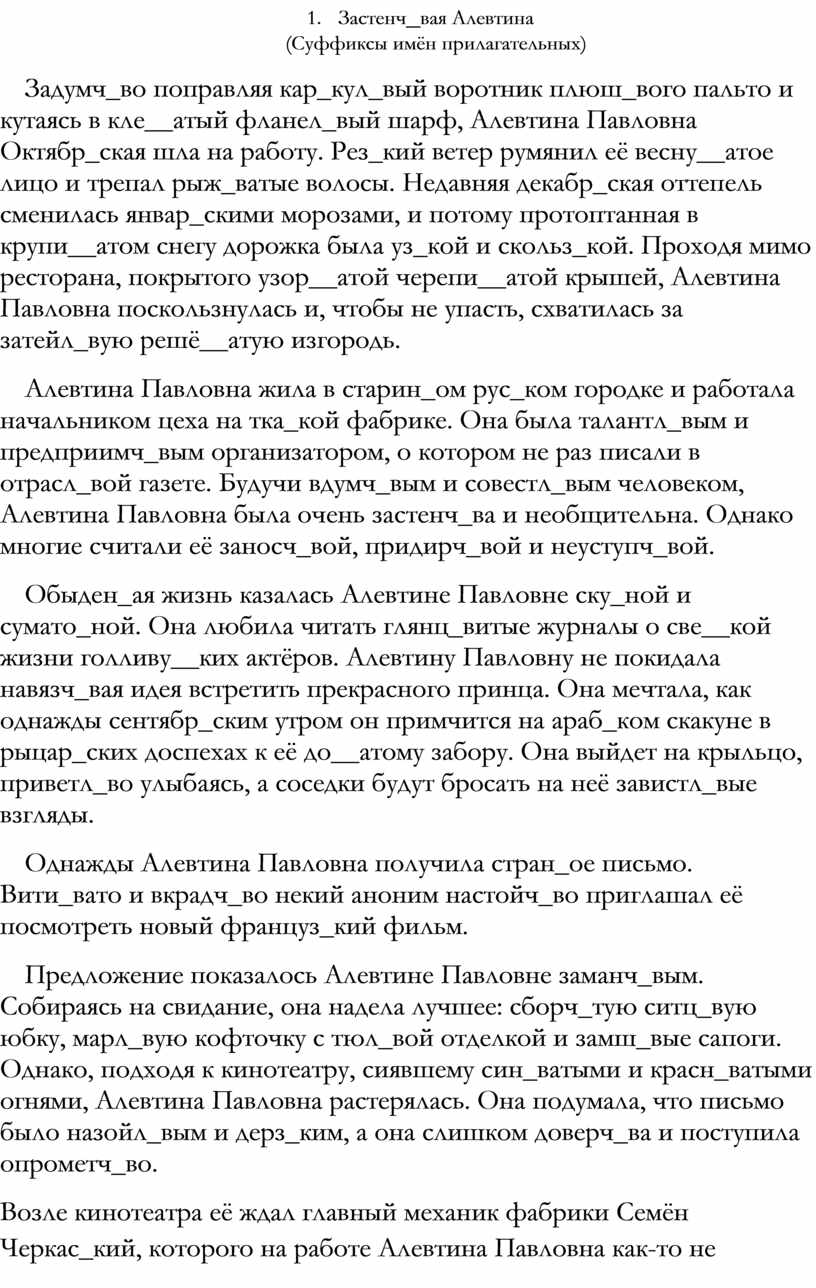 Алевтина Павловна жила в старин_ом рус_ком городке и работала начальником цеха на тка_кой фабрике. Она была талантл_вым и предприимч_вым организатором, о котором не раз писали в отрасл_вой газете. Будучи вдумч_вым и совестл_вым человеком, Алевтина Павловна была очень застенч_ва и необщительна. Однако многие считали её заносч_вой, придирч_вой и неуступч_вой.