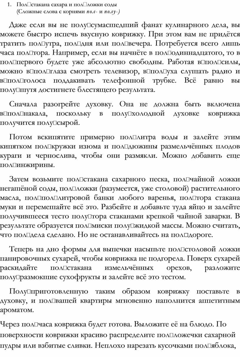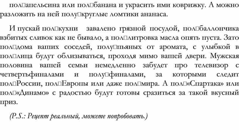 Даже если вы не полу‡сумасшедший фанат кулинарного дела, вы можете быстро испечь вкусную коврижку. При этом вам не придётся тратить пол‡утра, пол‡дня или пол‡вечера. Потребуется всего лишь часа пол‡тора. Например, если вы начнёте в пол‡одиннадцатого, то в пол‡первого будете уже абсолютно свободны. Работая в‡пол‡силы, можно в‡пол‡глаза смотреть телевизор, в‡пол‡уха слушать радио и в‡пол‡голоса поддакивать телефонной трубке. Всё равно вы полу‡шутя достигнете блестящего результата.