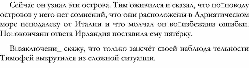 Сейчас он узнал эти острова. Тим оживился и сказал, что по‡поводу островов у него нет сомнений, что они расположены в Адриатическом море неподалеку от Италии и что молчал он во‡избежани ошибки. По‡окончани ответа Ирландия поставила ему пятёрку.