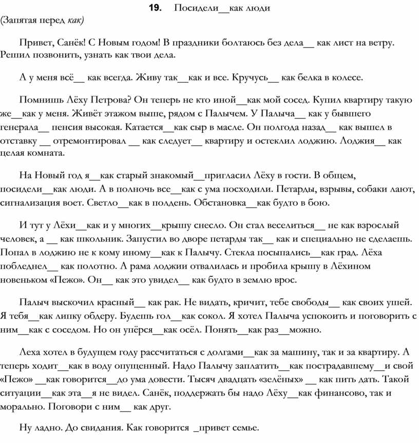 И тут у Лёхи__как и у многих__крышу снесло. Он стал веселиться__ не как взрослый человек, а __ как школьник. Запустил во дворе петарды так__ как и специально не сделаешь. Попал в лоджию не к кому иному__как к Палычу. Стекла посыпались__как град. Лёха побледнел__ как полотно. А рама лоджии отвалилась и пробила крышу в Лёхином новеньком «Пежо». Он__ как это увидел__ как будто в землю врос.