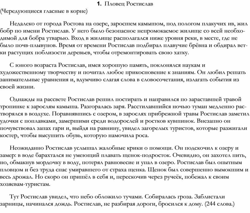 Тут Ростислав увидел, что небо обложило тучами. Собиралась гроза. Заблистали зарницы, начинался дождь. Ростислав, не разбирая дороги, бросился к дому. (244 слова.)