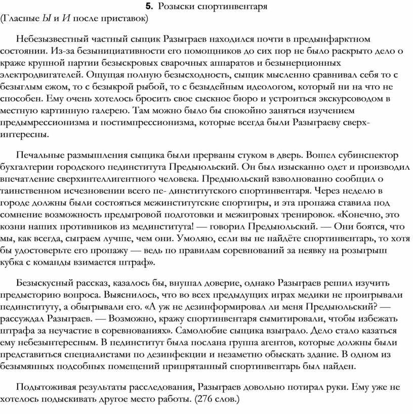 Небезызвестный частный сыщик Разыграев находился почти в предынфарктном состоянии. Из-за безынициативности его помощников до сих пор не было раскрыто дело о краже крупной партии безыскровых сварочных аппаратов и безынерционных электродвигателей. Ощущая полную безысходность, сыщик мысленно сравнивал себя то с безыглым ежом, то с безыкрой рыбой, то с безыдейным идеологом, который ни на что не способен. Ему очень хотелось бросить свое сыскное бюро и устроиться экскурсоводом в местную картинную галерею. Там можно было бы спокойно заняться изучением предымрессионизма и постимпрессионизма, которые всегда были Разыграеву сверхинтересны.