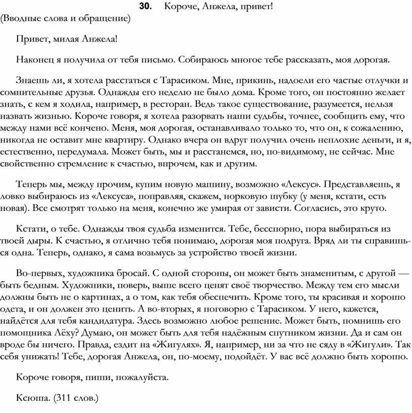 Знаешь ли, я хотела расстаться с Тарасиком. Мне, прикинь, надоели его частые отлучки и сомнительные друзья. Однажды его неделю не было дома. Кроме того, он постоянно желает знать, с кем я ходила, например, в ресторан. Ведь такое существование, разумеется, нельзя назвать жизнью. Короче говоря, я хотела разорвать наши судьбы, точнее, сообщить ему, что между нами всё кончено. Меня, моя дорогая, останавливало только то, что он, к сожалению, никогда не оставит мне квартиру. Однако вчера он вдруг получил очень неплохие деньги, и я, естественно, передумала. Может быть, мы и расстанемся, но, по-видимому, не сейчас. Мне свойственно стремление к счастью, впрочем, как и другим.