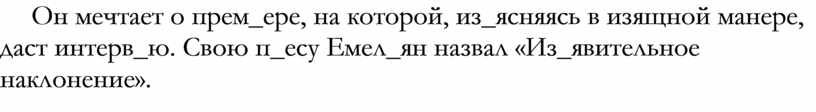 Теперь Емел_ян Под_ячев работает сторожем в дет_яслях. В пред_обеденный час он любит разложить пас_янс и, играя медал_оном и глядя на вол_ер с об_едающейся кураб_е обез_яной, вспомнить свои транс_европейские путешествия, в которых он об_ездил пол_Европы. Вечерами, сидя за комп_ютером, он пишет полные об_ективности в_едливые фел_етоны о рыночной кон_юнктуре или сочиняет п_есу о б_ющемся с неприятелем батал_оне, раз_единении войск, ар_ергардных боях и контр_атаках. Он мечтает о прем_ере, на которой, из_ясняясь в изящной манере, даст интерв_ю. Свою п_есу Емел_ян назвал «Из_явительное наклонение».