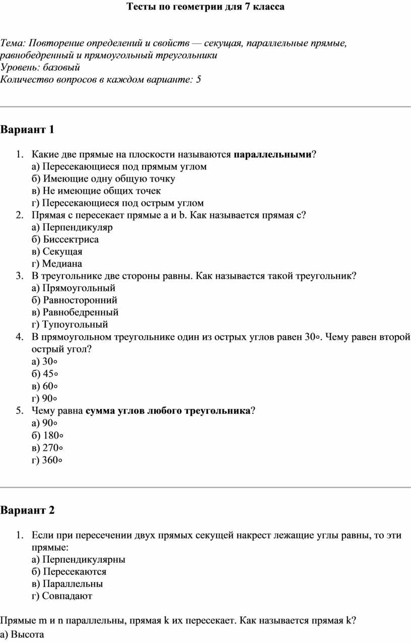 Тесты по геометрии для 7 класса
